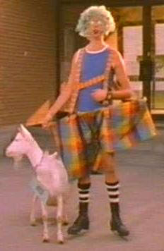 Which he, of course, did not do. The notion that he was rescued, however, is quite debatable because the circumstances he soon found himself in could arguably be considered a far inferior substitute for death. He awoke to the sensation of being helplessly thrashed about the interior of a filthy horse trailer, his dazed, limp form bound entirely in duct tape. When he grimly managed to slither upright and look out of the screened window he saw that the trailer was being hauled behind a madly careening beat up old pick-up truck racing through the rough dirt and gravel roads of a desolate desert landscape. One glance at the eyes that greeted him in the rear-view mirror and Ken immediately recognized the diabolically grinning visage of none other than Hildy Volksverstagg mere seconds before the vehicle slammed around a violent turn and he was dashed back to the manure covered floor into unconsciousness.